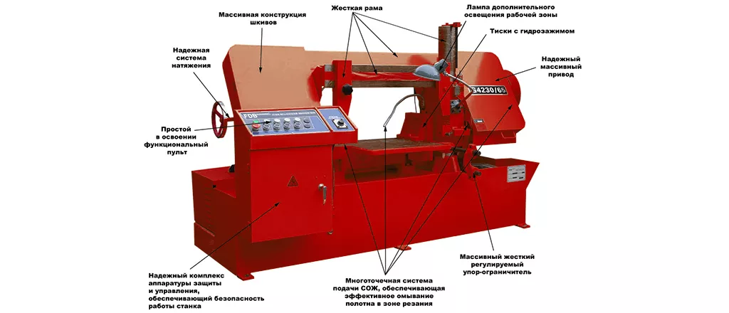 Ленточнопильный станок представляет собой высокоточное металлообрабатывающее оборудование. Конструкция агрегата состоит из следующих составляющих:- режущего элемента;