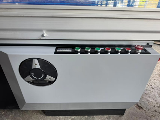 С лицевой части располагается штурвал наклона пильного узла, кнопки включения двигателей пил и подъема-опускания пильного узла.