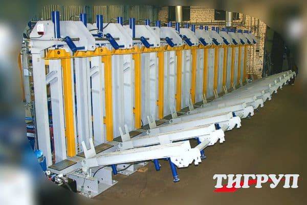 Загрузка и выгрузка пакета заготовок производится в горизонтальной плоскости посредством открывающихся (поворотных) фронтальных прижимных балок с гидроприводом подъема-опускания.