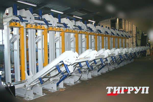 Автоматическая загрузка и выгрузка пакета клееного бруса производится в горизонтальной плоскости посредством открывающихся (поворотных) фронтальных прижимных балок с гидроприводом подъема-опускания.