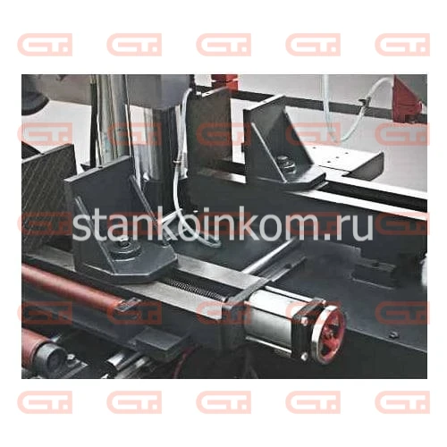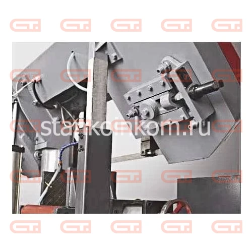 По этой причине все основные - несущие части станка изготовлены из чугуна, для придания жёсткости и максимальной виброустойчивости, отрицательно влияющей на стойкость ленточного полотна. Исполнение основных частей пильной рамы, тисков и поворотного устройства из чугуна. На ленточнопильном станке установлена очищающая щётка для очистки полотна.