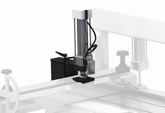 Пневмоприжим срабатывает по щелчку тумблера и фиксирует заготовку автоматически, без предварительной настройки на толщину заготовки.