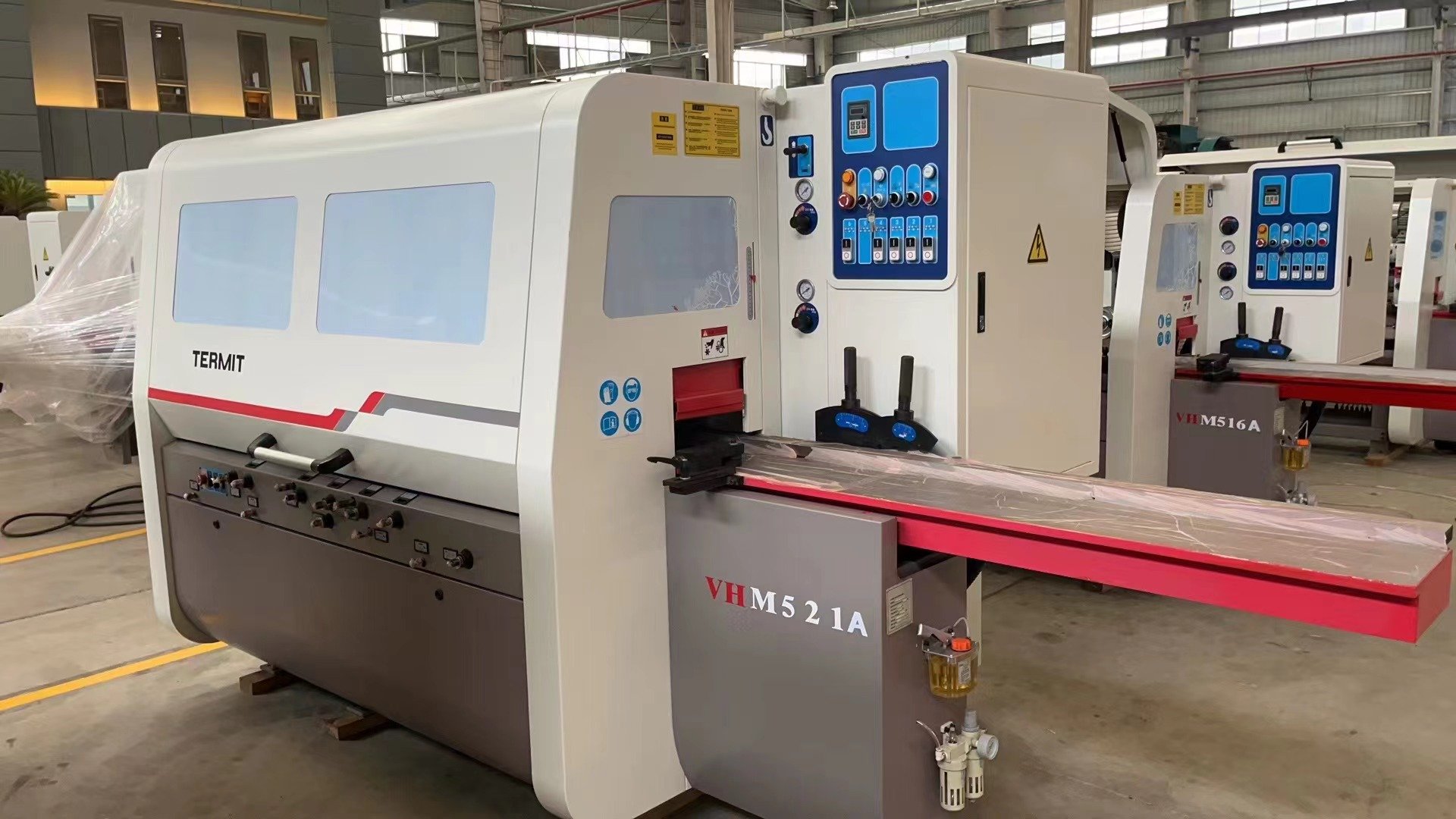 Станок оснащен автоматическим подъемным клеенаносящим барабаном, регулятором скорости подачи каретки, датчиком недостаточного давления в пнемосистеме, поворотным суппортом поджатия последней заготовки в пакете.