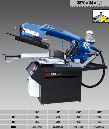 Совершенно новая технология литья пильной рамы и обновленный уникальный дизайн. Литье корпуса рамы выполнено с полыми карманами, проходящими по всей длине рамы, что позволило добиться большей жесткости рамы и повышения точности реза. Использование прочной, широкой ленты является оптимальным выбором для обеспечения всех потребностей производства. В новой модели используется полотно с шириной 34 мм и толщиной 1.1 мм, позволяющие использовать данный станок для распиловки труднообрабатываемых материалов с большими сплошными сечениями, в том числе нержавеющих и инструментальных сталей. Поворот рамы осуществляется в диапазоне от -45⁰ до 60⁰. Подъем рамы осуществляется вручную, рабочая подача производится под тяжестью собственного веса рамы с возможностью простого регулирования дроссельного клапана подающего гидроцилиндра. После окончания пропила привод пилы автоматически останавливается. Для облегчения подъема рамы, станок оснащен пружинной системой с возможностью регулировки натяжения для изменения усилия необходимого для подъема и опускания рамы.
