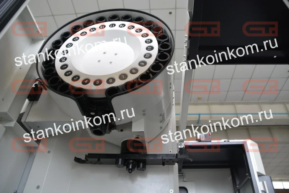 Инструментальный магазин зонтичного типа (барабан) на 20 ячеек, а выбор заданной позиции инструмента осуществляется в любом направлении по кратчайшему пути, сокращая машинное время при многоинструментальной обработке.Каждая из основных осей станка имеет собственный сервопривод и прецизионную ШВП (класса C3), что дает высокую скорость и точность рабочих ходов. Так линейные направляющие качения (оси X и Y) и скольжения (ось Z) позволяют скорость перемещений исполнительных органов станка до 24 м/мин при точности позиционирования не более ±0,005 мм.